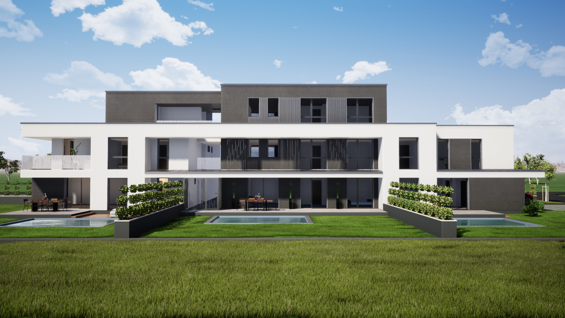 - a zöldfelületek füvesítve és az automata öntöző rendszer, illetve a medence kiépítéséhez szükséges csatlakozás kiépítésével