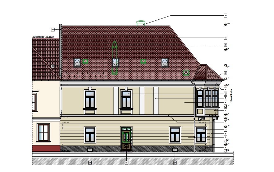 Győr belvárosának közvetlen közelében, a Bercsényi liget és a Rába folyó ölelésében található ez a műemléki védelem alatt álló, elegáns és harmonikus megjelenésű épület. A Kossuth Lajos utca és a Burcsellás köz sarkán elhelyezkedő, nyeregtetős, kétemeletes lakóház történelmi karakterét megőrizve biztosít kiváló lehetőséget a modern városi életstílushoz.