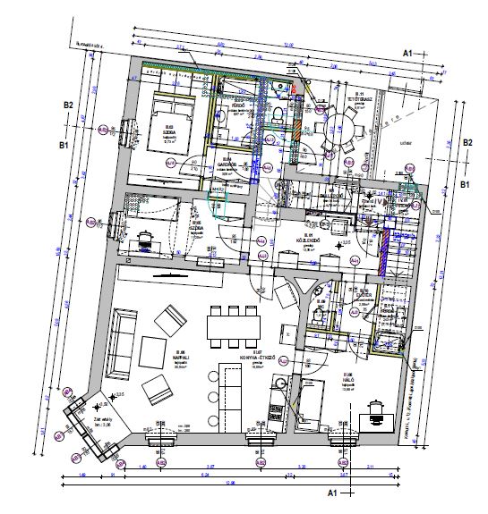 nappali-étkező- konyha + 3 hálőszoba + 2 fürdőszoba kialakítású