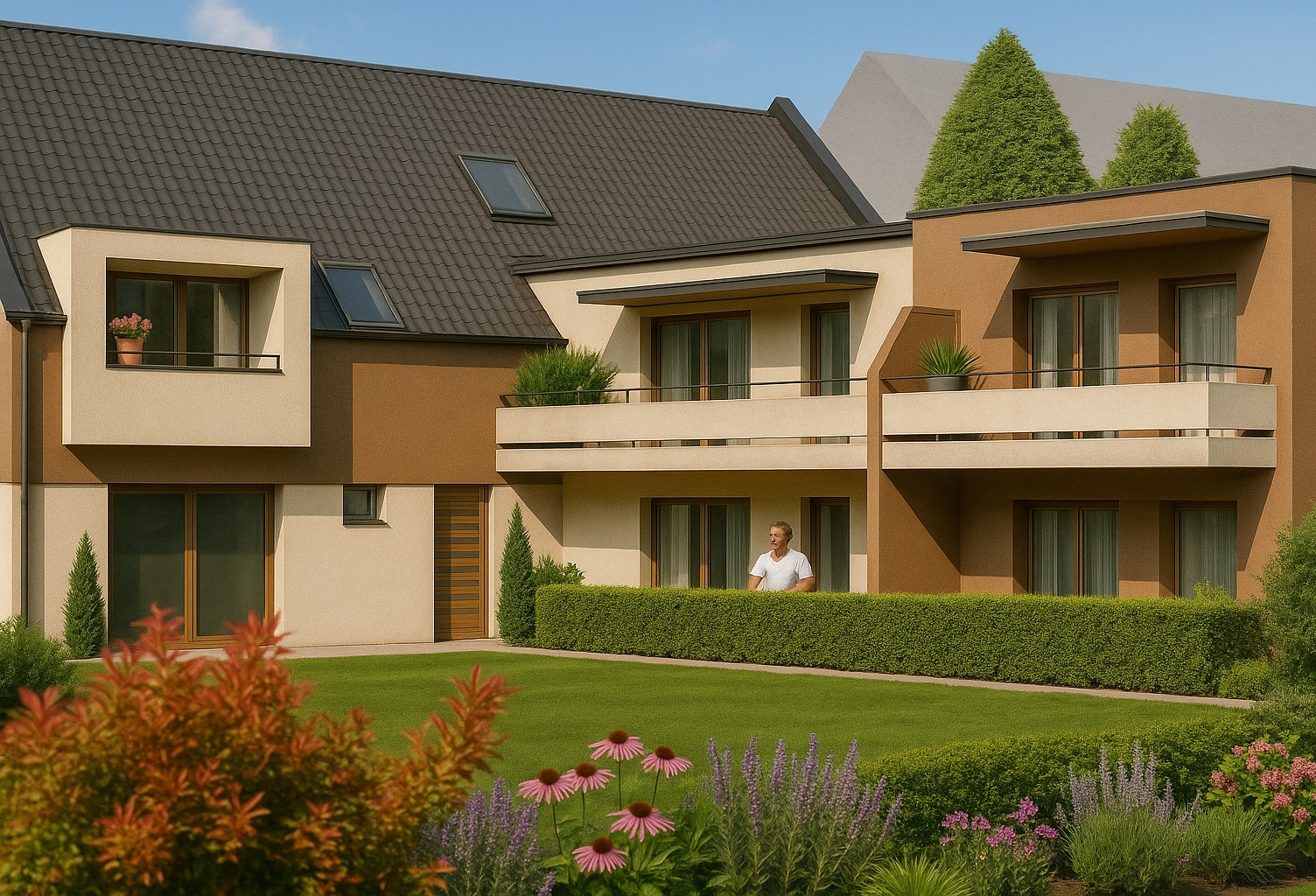 Jánossomorján, Ausztria szomszédságában, Mosonmagyaróvártól 15 km távolságra új építésű tárasházban 13 lakás és 2 utcafronti üzlethelyiség eladó!