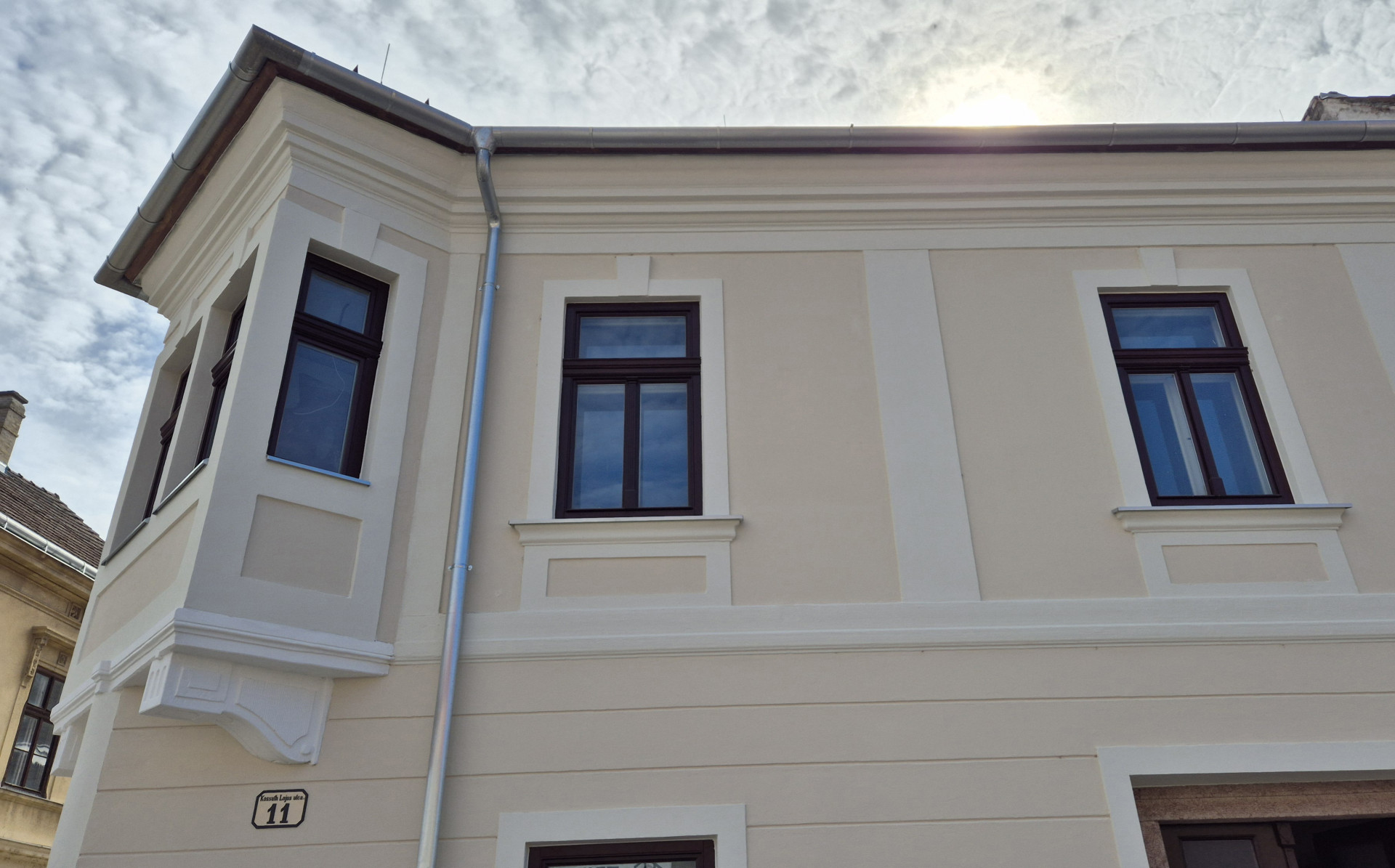 A Kossuth Lajos utca és a Burcsellás köz sarkán álló, nyeregtetős, két emeletes lakóház elegánsan illeszkedik a városi miliőbe, megőrizve a történelmi értékeket, miközben modern életvitelre nyújt kiváló lehetőséget.